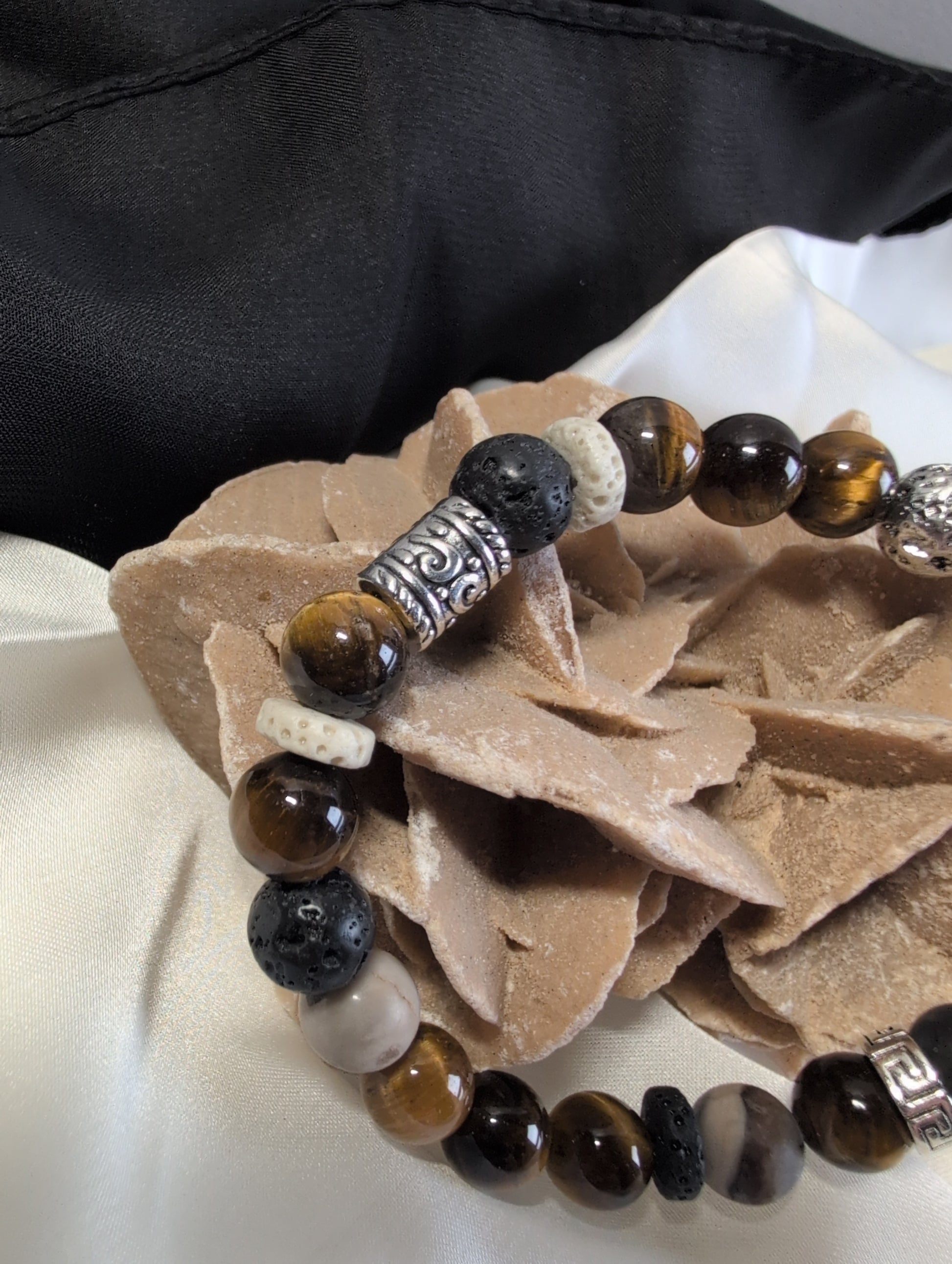 Pièce d'une rare distinction où la virilité rencontre le raffinement. Les nuances fauves de l'œil de tigre, semblables à un velours de terre, s'entrelacent avec le noir profond et velouté des billes de lave. L’élégance réside dans le détail : les séparateurs aux gravures nordiques agissent comme des bijoux d'orfèvre, transformant un bracelet de pierres en une véritable parure. Un équilibre parfait pour l'homme qui porte sa force avec une grâce naturelle."